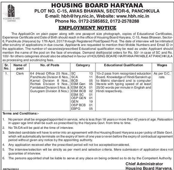 Housing Board Haryana has disseminated a job notification as Housing Board Haryana Recruitment. Organization is inviting application form from well talented and capable contenders to fill up the vacancy of 64 Clerk Jobs by filling and submitting application form through Offline mode on or before the closing date (17th April 2017).
